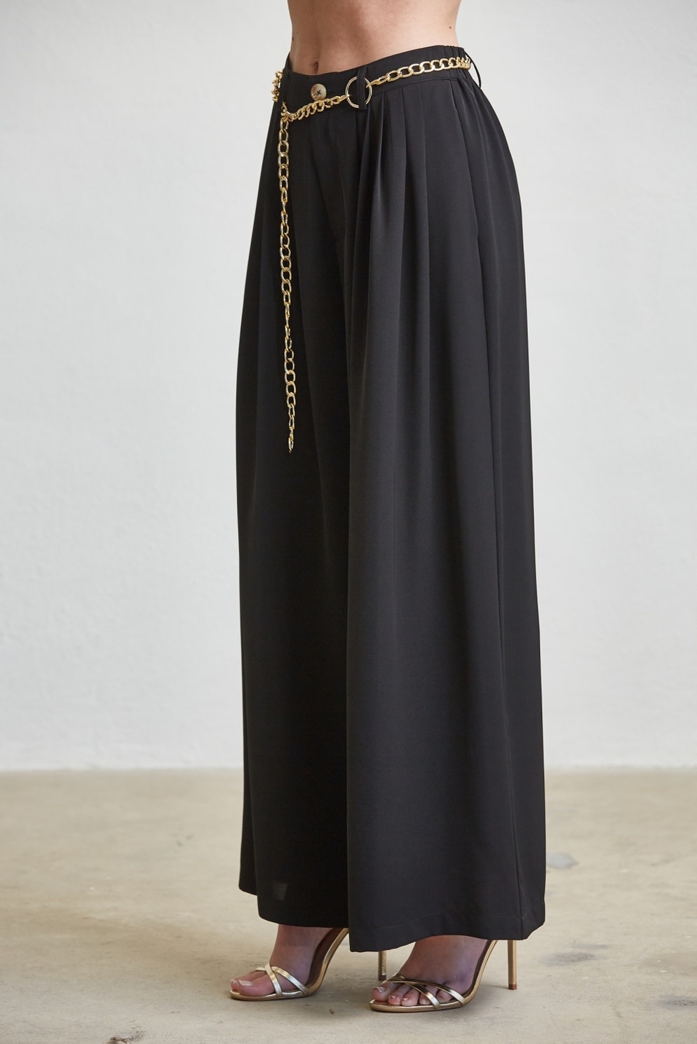 - Flowing wide-leg silhouette with soft front pleats - Removable chain belt detail for added refinement - Elastic back waistband for comfort and flexible fit - Full-length drape with smooth, elegant movement - Secure front closure with belt loops for accessorizing
