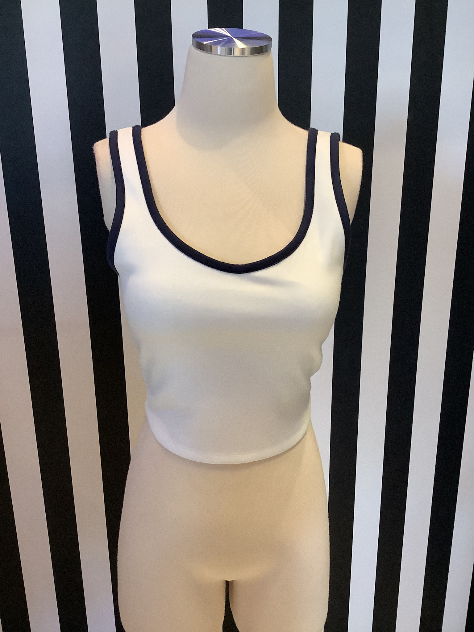 This stylish women's tank top features a classic white design with navy trim. Perfect for casual outings or layering