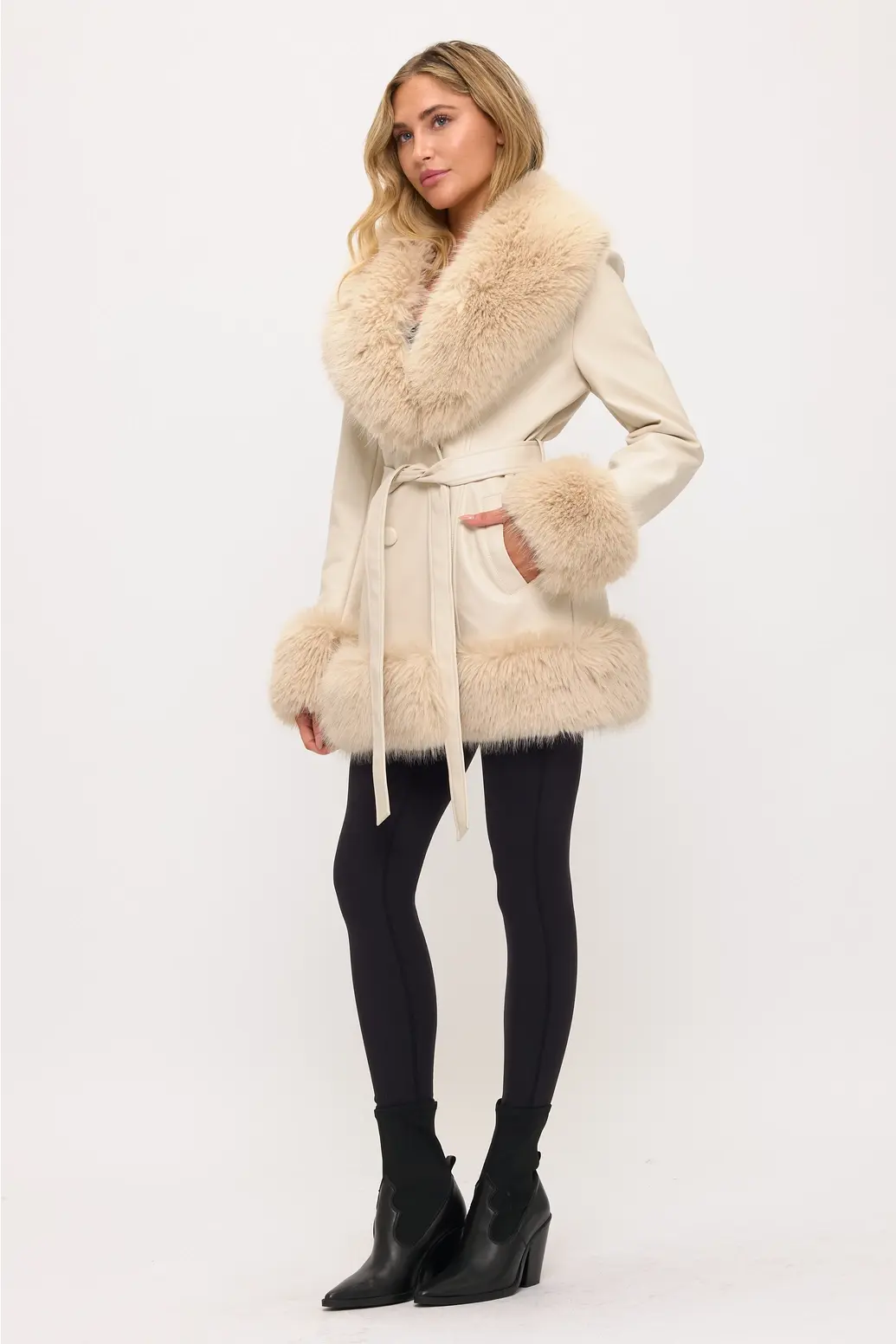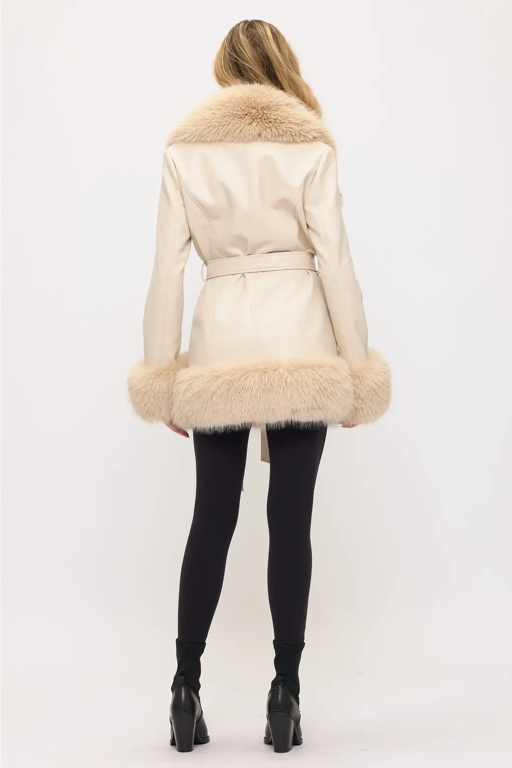 This sophisticated double-breasted coat combines sleek faux leather construction with luxurious matching faux fur trim to create monochromatic elegance. The dramatic oversized collar and coordinating hem and cuff details provide exceptional warmth while delivering opulent visual impact. The fitted silhouette features classic double-breasted button closure that creates structured sophistication and flattering proportions. Premium synthetic leather offers durability and contemporary appeal, perfectly complemented by plush fur accents. The knee-length cut ensures elegant coverage while maintaining versatile styling options. Long sleeves and tailored construction provide both comfort and polished appearance throughout colder seasons.