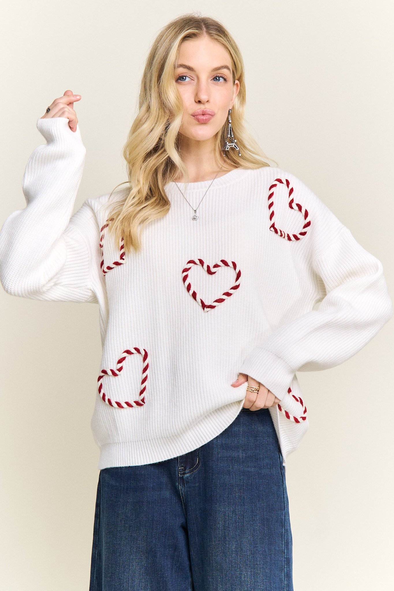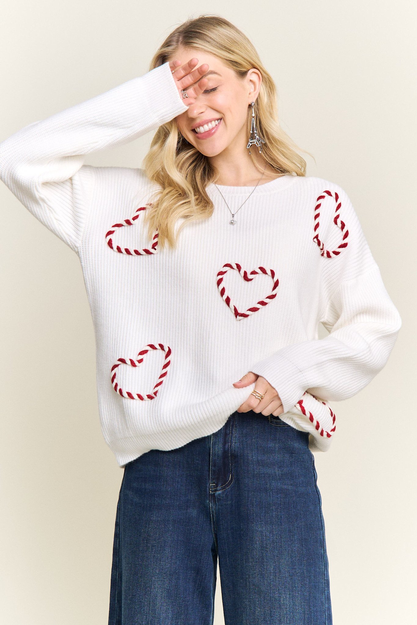 Stylish white sweater featuring red candy cane heart patterns. Perfect for a cozy festive look.