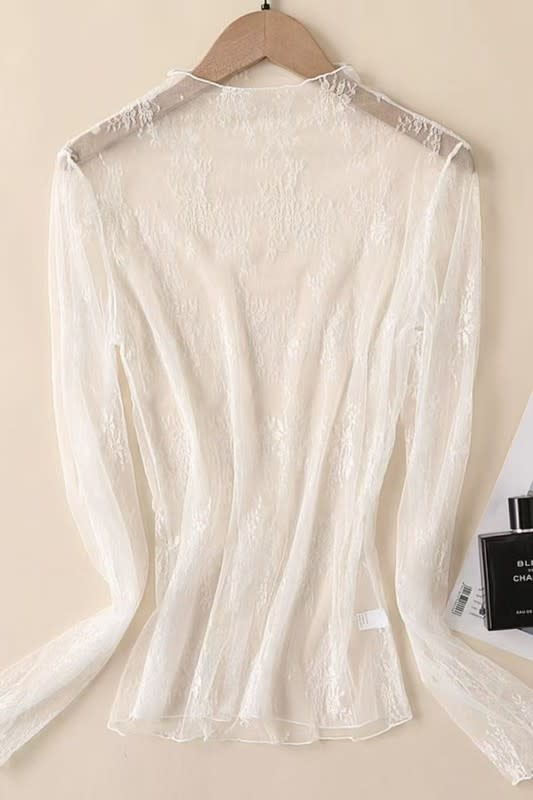 Elegant sheer lace top with long sleeves. Perfect for layering or a night out.