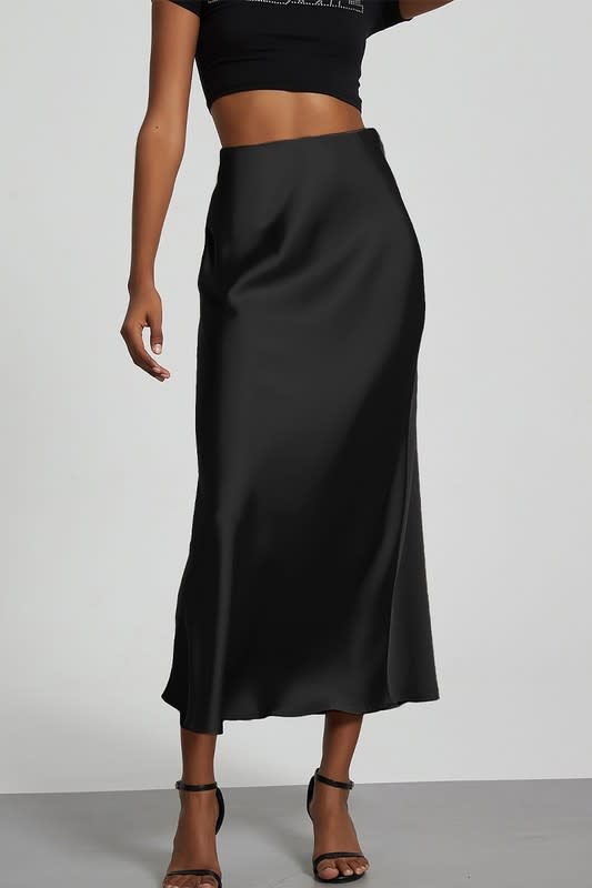 This elegant black satin maxi skirt is perfect for any occasion. Its sleek design offers a sophisticated look. Pair it with your favorite top for a chic ensemble.