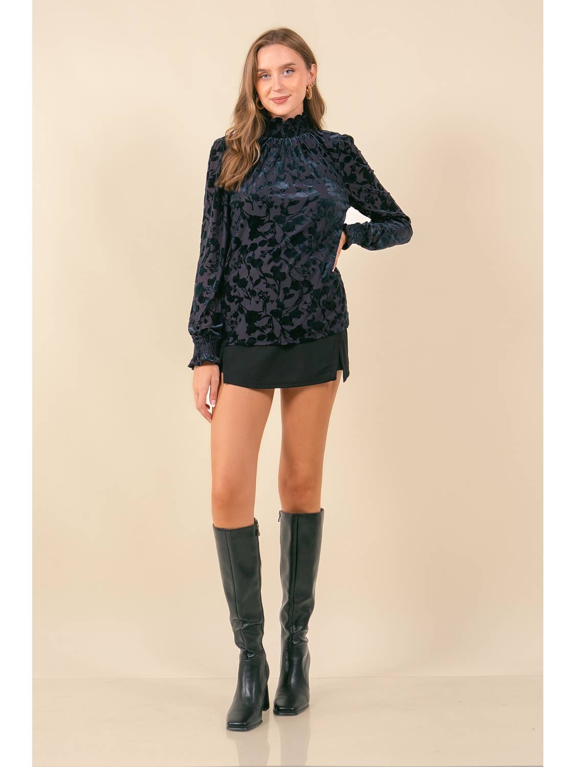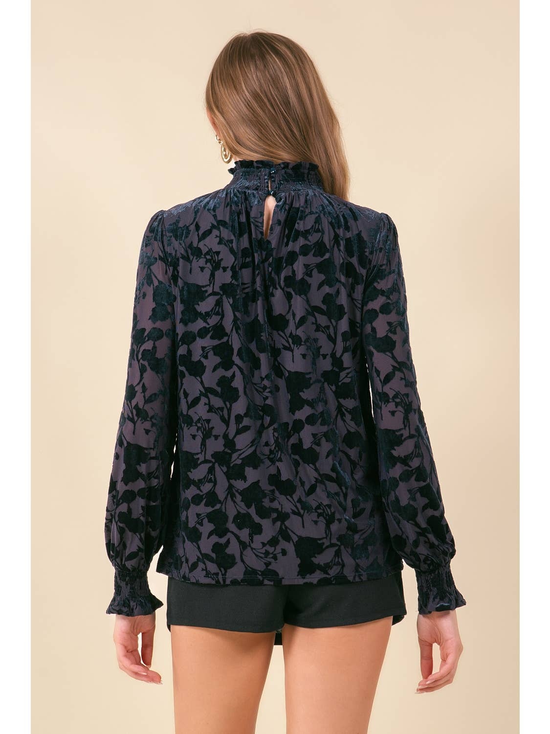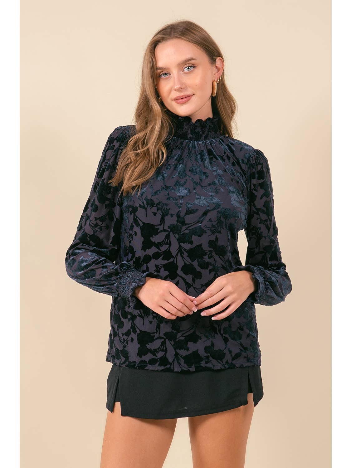 Luxurious velvet fabric with a floral pattern in dark slate and black - Smocked mock neck design for an elegant, feminine look - Back button closure for easy wear and a sleek silhouette - Versatile top suitable for both casual and dressy occasions