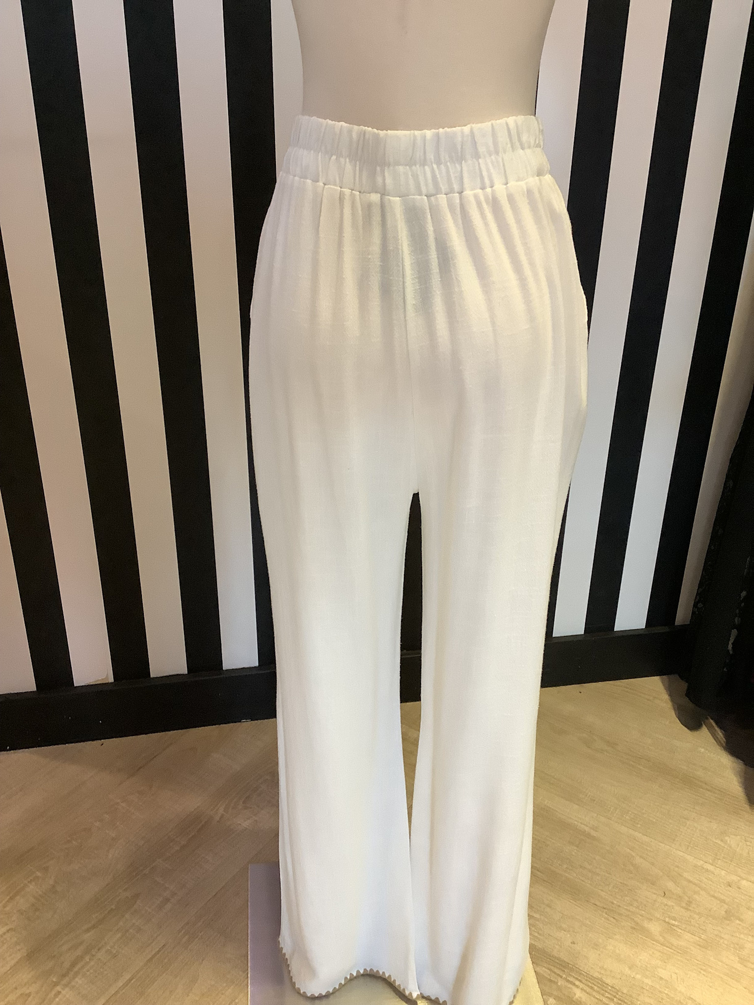 These elegant white women's pants feature a stylish tan trim, perfect for any occasion. The comfortable fit and chic design make them a must-have addition to your wardrobe.