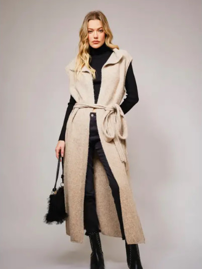 Stylish long beige sleeveless coat with a tie belt. Perfect for layering.